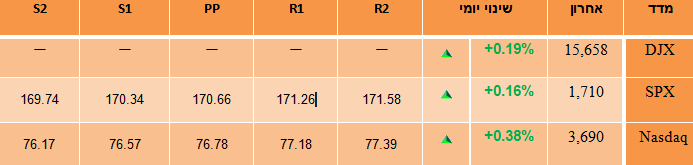 נראה שהבמה ערוכה ומוכנה לעליות נוספות, כאשר הסמולקאפס מובילים את הדרך והתנודתיות בשפל יחסי. מדד הראסל 2000 שעוקב אחרי המניות הקטנות בשוק הצליח להשיג שיא של כל הזמנים ביום שני, עם תעודת הסל IWM שעוקבת אחרי המדד מסיימת בעליות של 0.34% ,בעוד מדד ה-VIX, מכשיר המודד את התנודתיות בשוק צונח לשפל של 5 חודשים ברמה של 11.84 נק'.