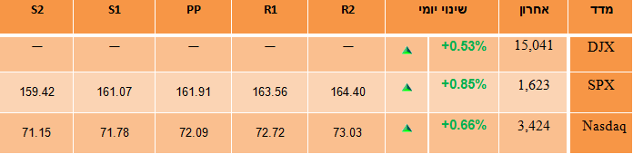 3 המדדים סיימו את יום חמישי התנודתי בסמוך לגבוה היומי. סביב אמצע היום, מדד ה-S&P 500 שבר את הממוצע נע ל-50 יום ברמת 161 נק' על תעודת הסל SPY ואת המספר העגול 1,600 נק' על המדד עצמו. זוהי הפעם הראשונה בה המדד בוחן רמה זו מאז ה-18 לאפריל. אך שבירה זו החזיקה זמן מועט בלבד. באמצע היום הקונים יצאו מהמארב בממוצע נע 50 והחלו לקנות מניות בצורה אגרסיבית. כתוצאה מכך מדד ה-S&P 500 סיים את היום בעליות של 0.9%.