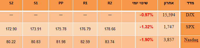 שאר השוק החסיר פעימה לנוכח פתיחת ההנפקה בטוויטר. קוואלקום (QCOM) נפלה ב-3.8% לרמה של 67.09$, אחת המשקולות הכבדות ביותר גם על ה-S&P 500 וגם על הנאסדק 100, לאחר שהחברה הנמיכה את תחזית ההכנסות לרבעון הרביעי ולשנה כולה. הנאסדק הובל למטה ע"י צלילה של 11% במניית WFM, לאחר תוצאותיה ששוחררו ביום רביעי בערב. טסלה מוטורס (TSLA) המשיכה לצלול כאשר היא מוסיפה לצניחה שלה בת ה-18% מיום רביעי עוד 7.5% במהלך המסחר אתמול, לאחר שיצרנית הרכב החשמלי המפואר שיחררה דוחות רווח אפרוריים, סירבה להעביר תחזית מכירות לשנת 2014, וסבלה פעם נוספת מידיעות על שריפה שלישית באחד הרכבים שלה.