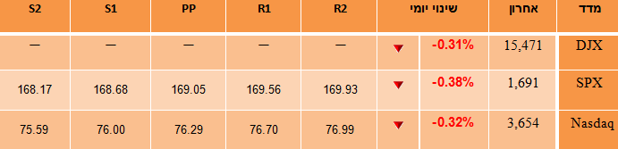 בהתחשב ברמות הנוכחיות ובכמה מהר ה-S&P 500 השיג את 100 הנק' האחרונות, נראה כי סוחרים מחפשים הזדמנות לקחת רווחים. אך בסה"כ הסימנים הכלכליים עדיין בריאים ורווחי הפירמות מחזיקים מעמד. ה-S&P 500 סגר בירידה של 0.4% ורשם את יום הירידות השלישי ברציפות. המדד ירד לרמות הנמוכה ביותר בשעה הראשונה לפעילות, לפני שבילה את שארית יום המסחר בטיפוס ארוך ואיטי. כאשר המומנטום חזק, מדדים ומניות נוטים לברוח לממוצעים הנעים למעלה. במקרים אלו חזרה לממוצעים הוא התהליך הבריא והנכון לפני שהנכסים יכולים להמשיך למעלה. אתמול מדד ה-S&P 500 חזר לממוצע נע ל-20 יום, הקונים ארבו למדד ברמות אלו ומיד שיחררו את פקודות הקניה שסיפקו תמיכה והחזירו אותו חזרה למסלול לסיום בגבוה היומי. אנחנו מצפים כי המדד יצליח להיתמך מעל 1,650 נק' (165 נק' על תעודת הסל SPY), בכל חולשה מהותית שיפגין.